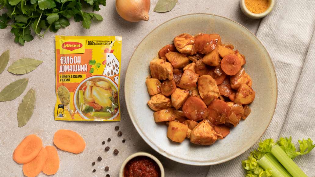 Развести смесь MAGGI® Бульон Домашний с курицей, овощами и зеленью по инструкции и добавить 1 стакан готового бульона к овощам, аккуратно перемешать, довести до кипения и тушить на небольшом огне 10 мин.