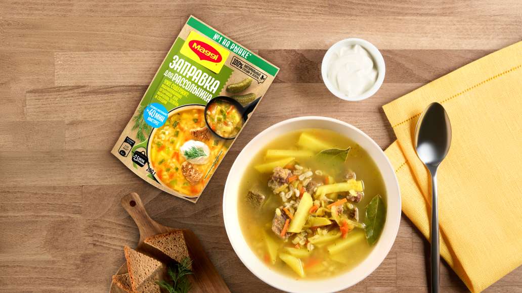 За 5 минут до готовности добавьте упаковку Магги® Заправка для Рассольника. Рекомендуем подавать с зеленью и сметаной.